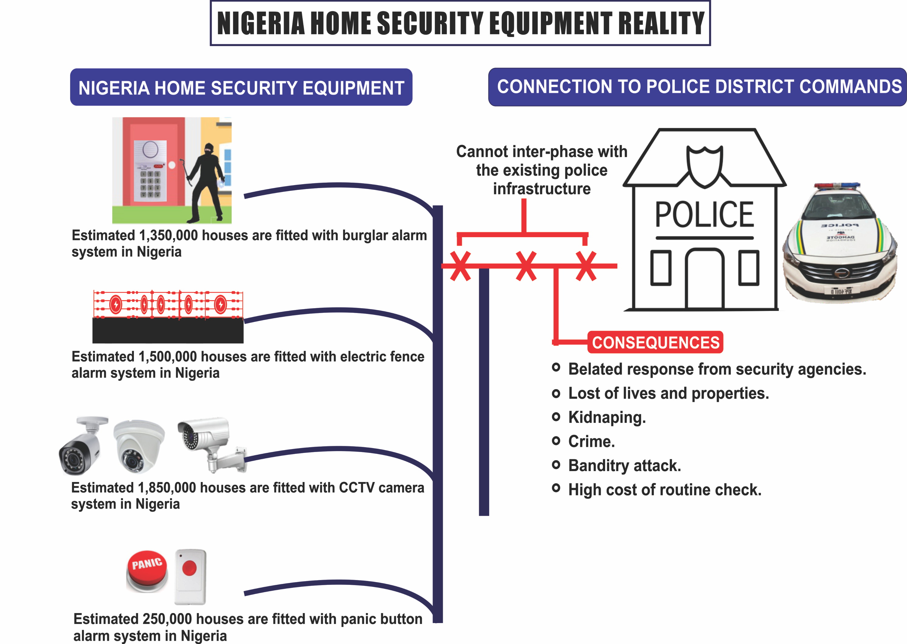 It is worthy to note that most of this equipment cannot connect to any Security Agencies. It is estimated that an average of 1,850,000 CCTV, 1,350,000 burglar alarm, 1,500,000 electric fence, 250,000 panic button etc. are presently installed in Nigeria.