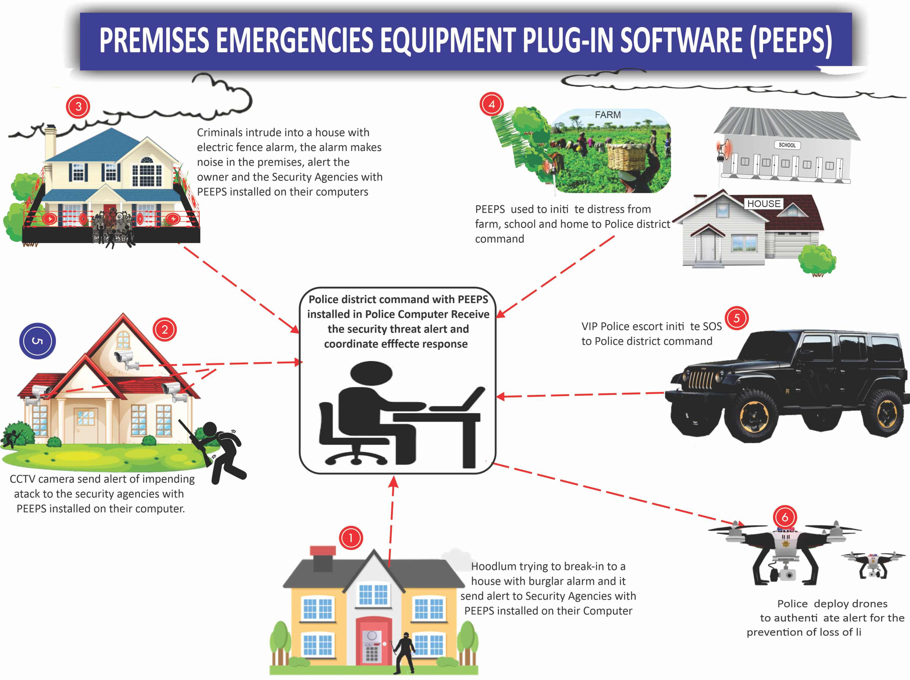 PEEPS is a security value added service NISPSAS proprietary software developed as a plugin interface to assist public integrate their home security equipment to the police and other security agencies. Example of such equipment include CCTV, electric fence, burglar alarm, panic button etc. This machine to machine interaction enables the Force to receive crime threat alerts when there is crime such as kidnapping, banditry, breaking-in, etc. are happening and proactively respond.